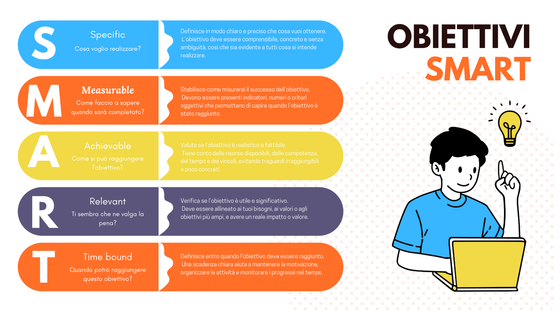 La cosa importante, però, è questa: un obiettivo si può chiamare SMART solo se contiene tutte e cinque le caratteristiche. Se ne manca anche una, spesso resta a metà strada: magari è una buona intenzione, magari è motivante, ma non diventa una guida concreta nelle decisioni quotidiane.